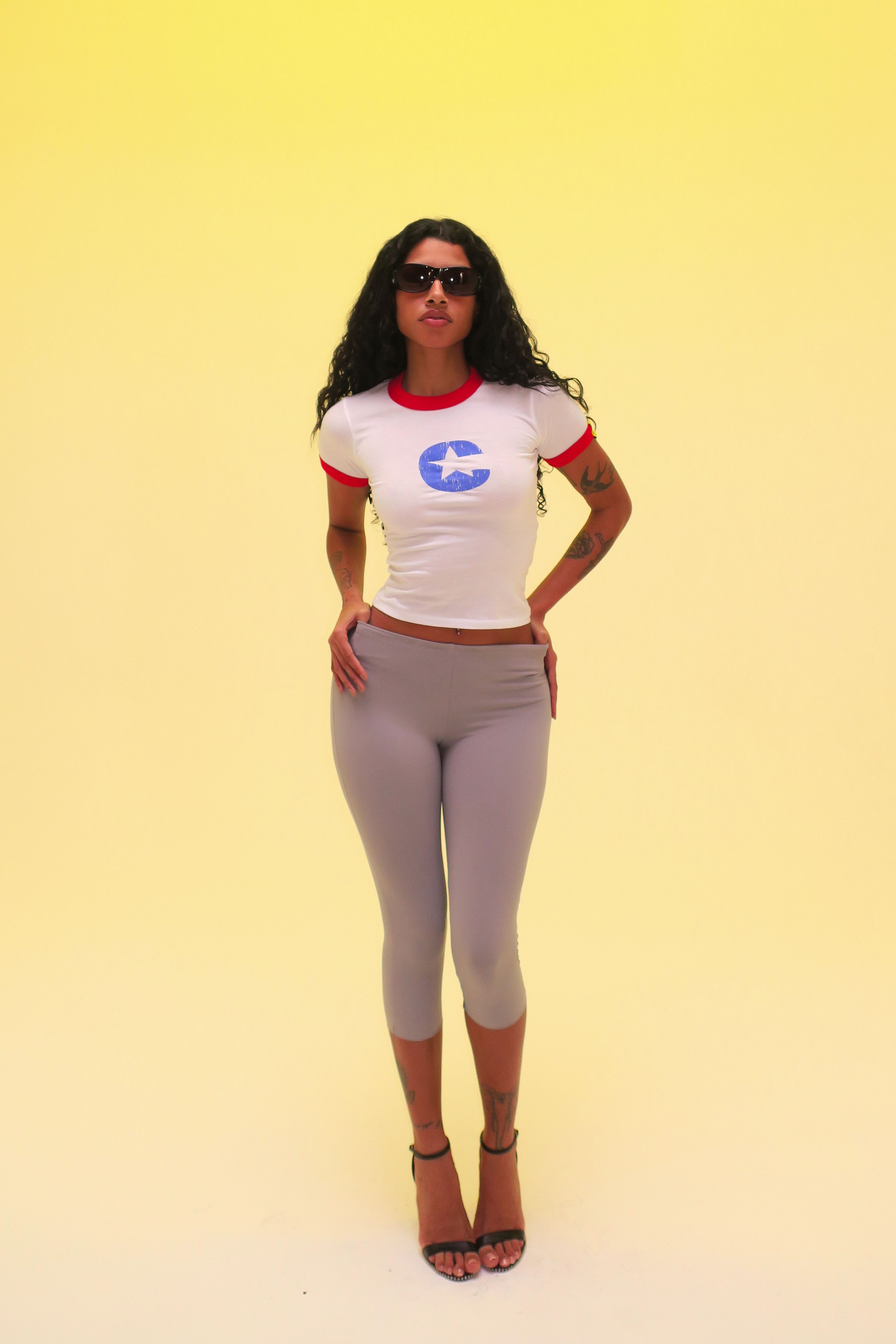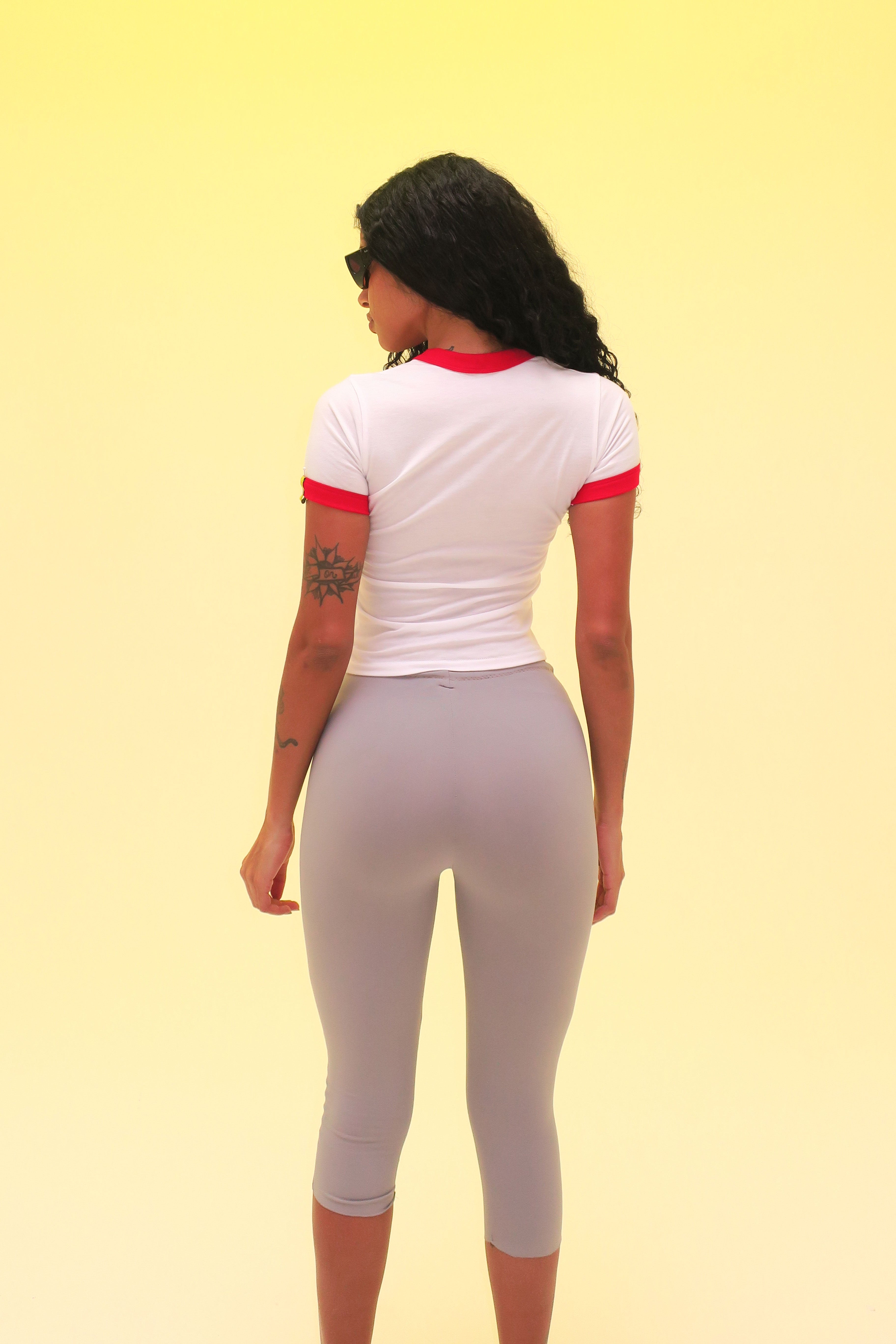 Europa in new fabric and in a new fresh color! Icy grey. spandex. form fitting. soft fabric. Model is wearing a size XS. Elastic band. raw hem.