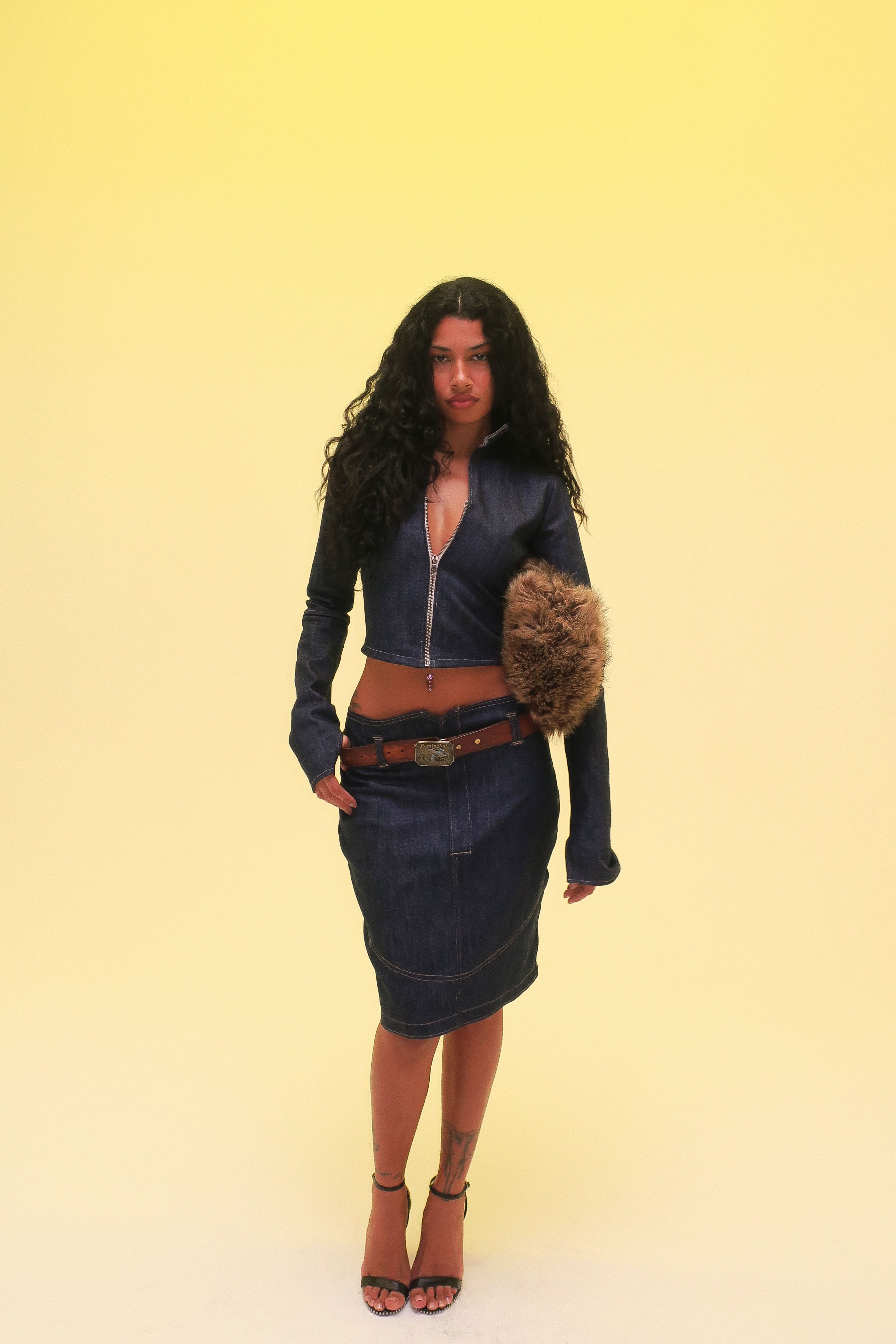 Sophisticated but also make it fashion. An elevated design from our infamous Genia Mini skirt. Small belt loops. pockets in back. Intentional stitching all around the skirt. Perfect with our new denim zip-up top LUNE. Model is wearing a size small.